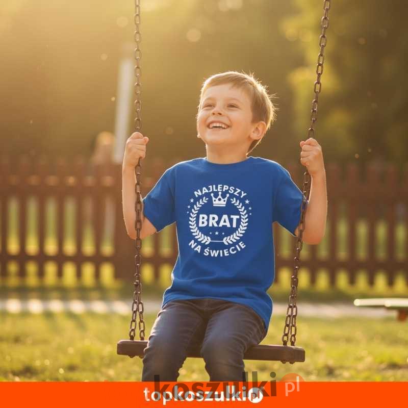 Ta niebieska koszulka z nadrukiem to coś więcej niż ubranie. To oficjalne potwierdzenie, że noszący ją chłopiec jest 'Najlepszym Bratem na Świecie'. To duma, którą może nosić na co dzień, a każdy, kto go spotka, od razu będzie wiedział, jak jest ważny.