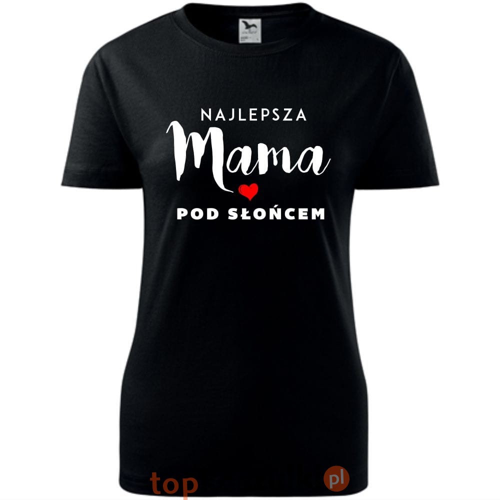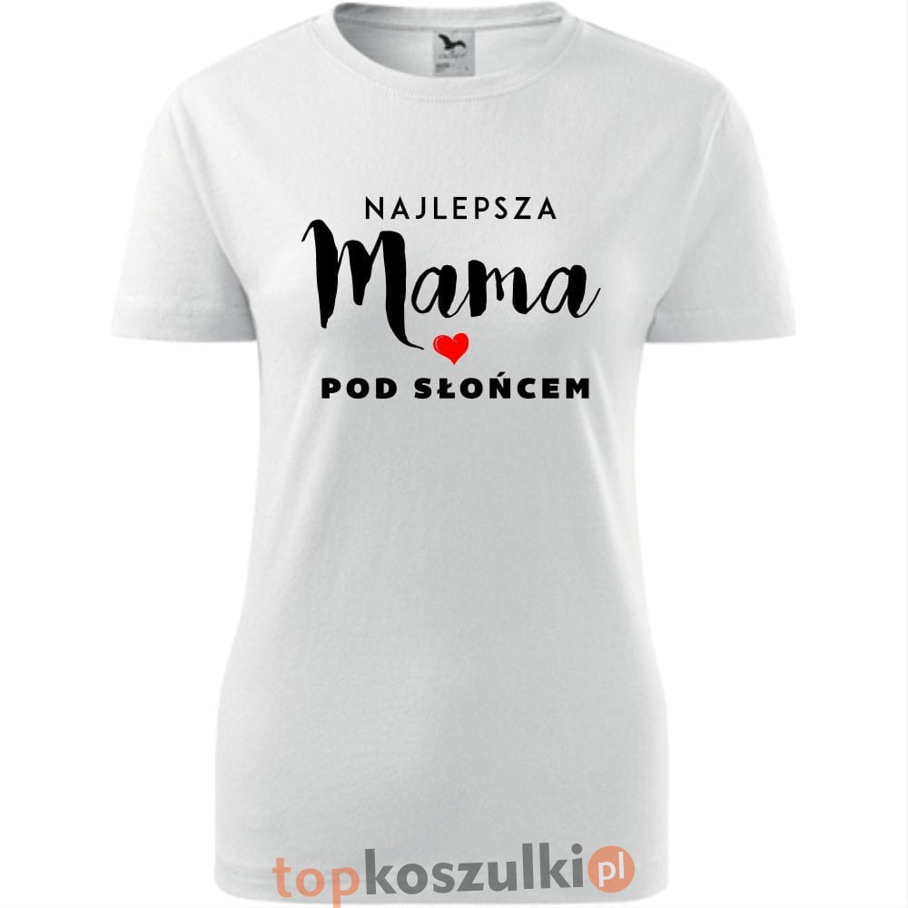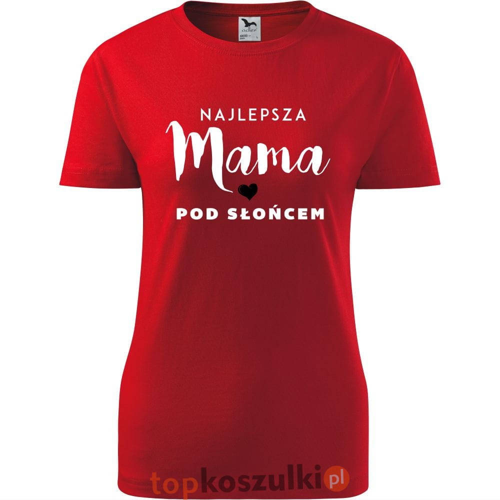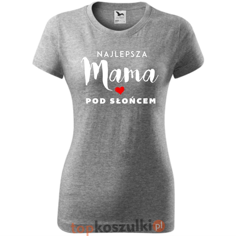 Wzruszający nadruk: Na koszulce znajduje się nadruk z napisem "NAJLEPSZA Mama POD SŁOŃCEM". Słowo "Mama" jest napisane ozdobną czcionką z małym, czerwonym serduszkiem, co dodaje koszulce wyjątkowego, osobistego charakteru.