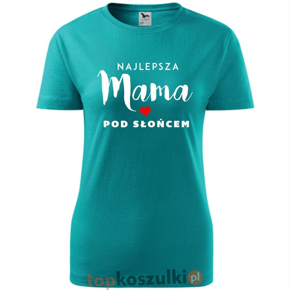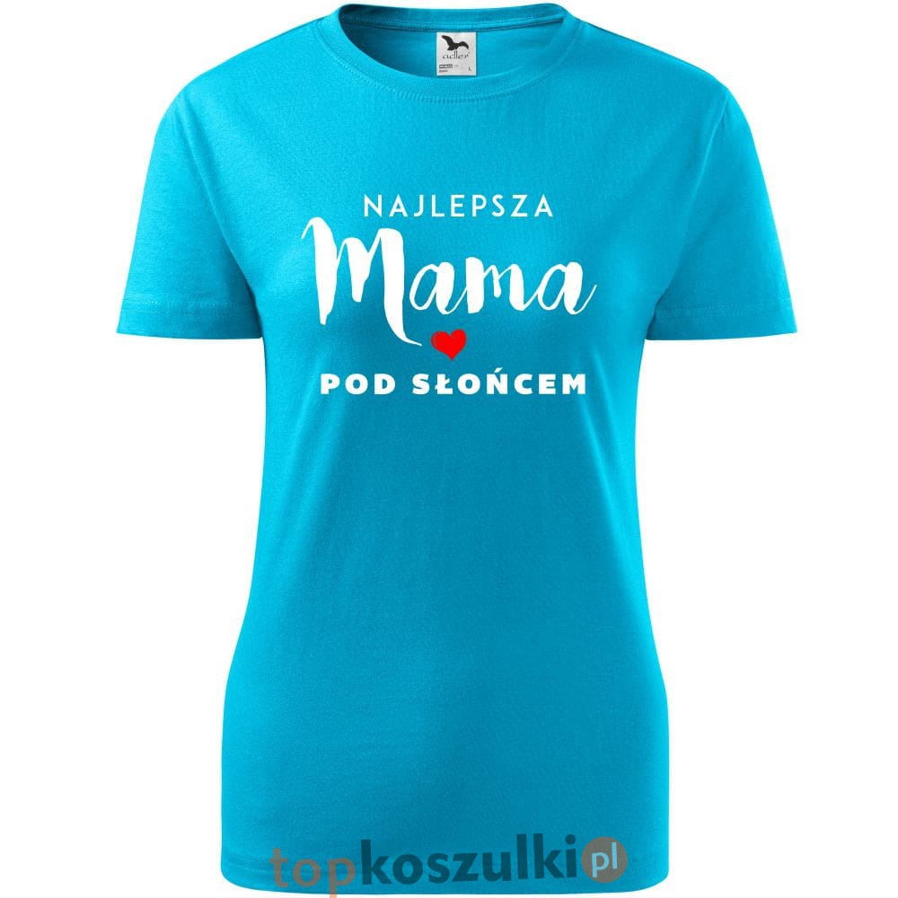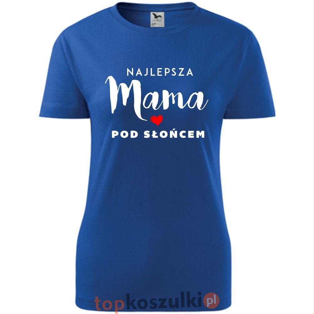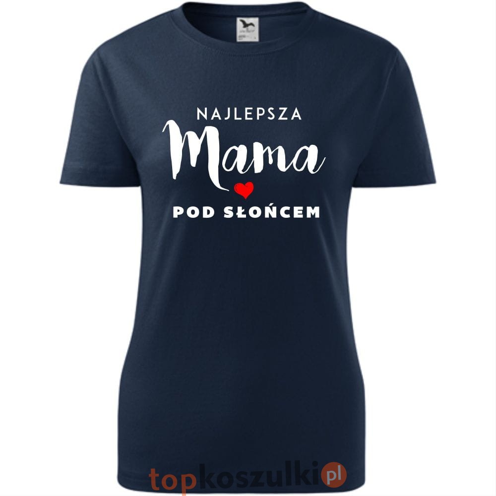 Wzruszający nadruk: Na koszulce znajduje się nadruk z napisem "NAJLEPSZA Mama POD SŁOŃCEM". Słowo "Mama" jest napisane ozdobną czcionką z małym, czerwonym serduszkiem, co dodaje koszulce wyjątkowego, osobistego charakteru.