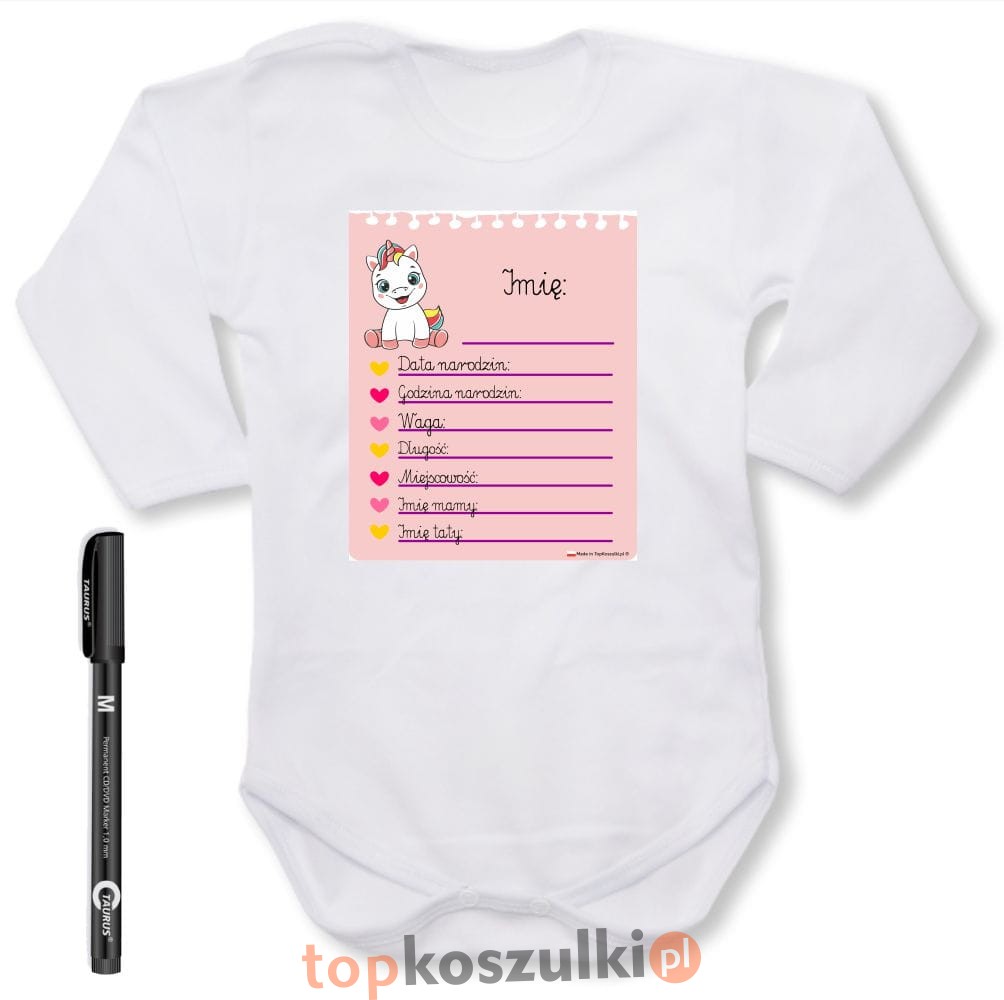 dziecięce body z dł. rękawem - metryczka dla dziewczynki + pisak do ręcznego wypisania, niespotykany prezent, pamiątka, wersja 02