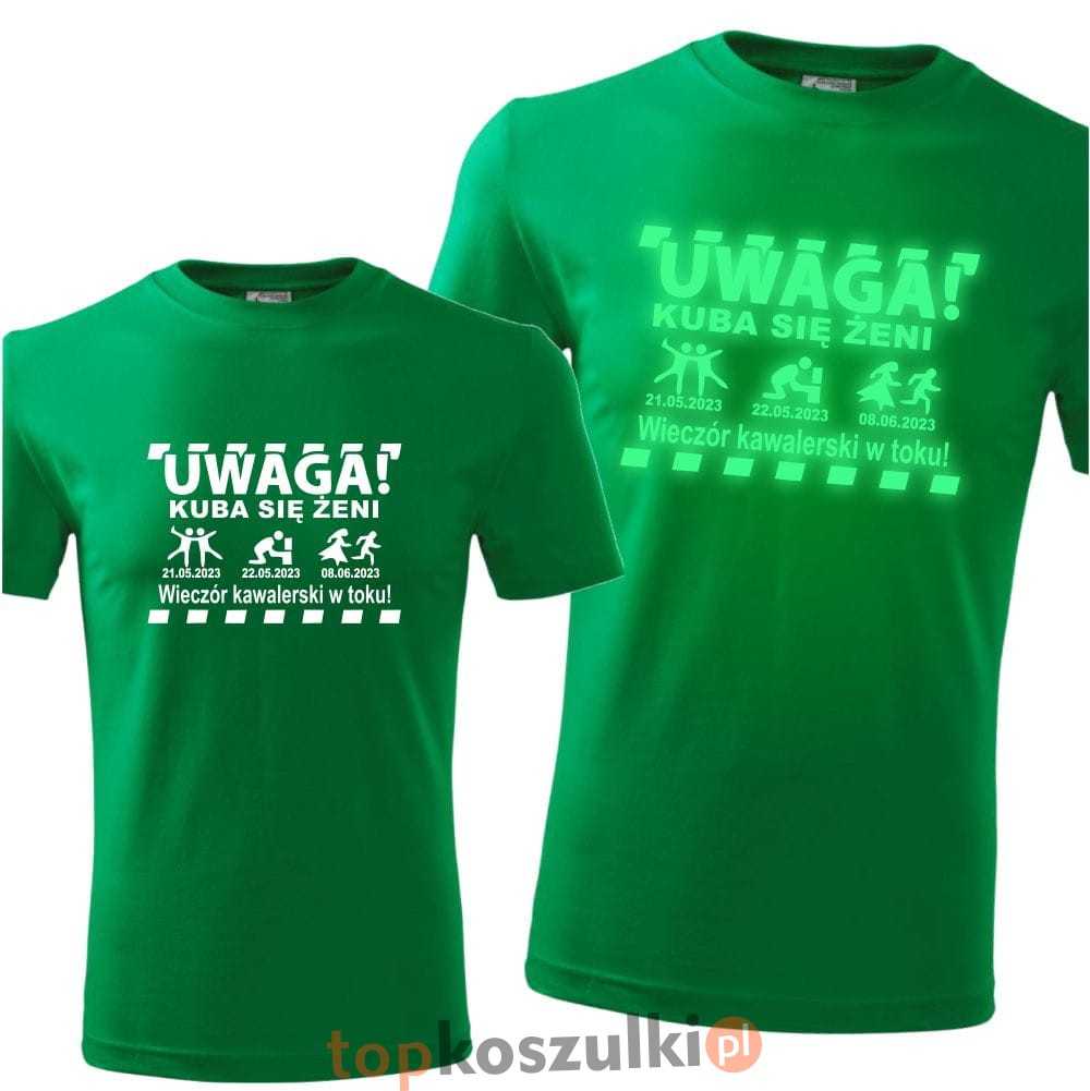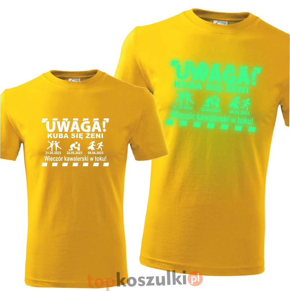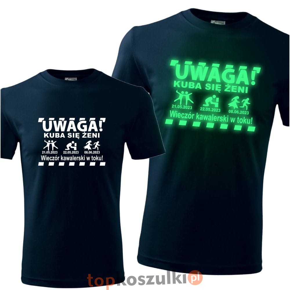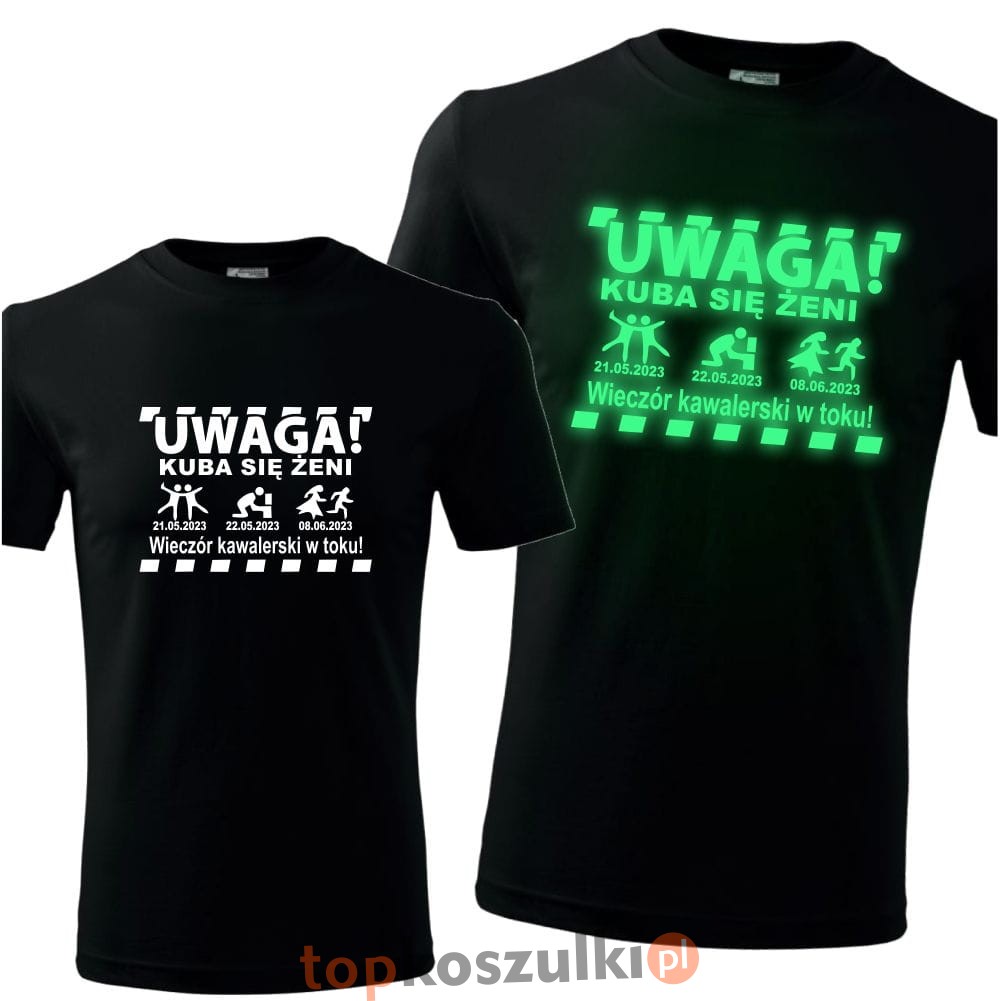 męska koszulka z nadrukiem świecącym w ciemności - uwaga 01 + dowolne imię + się żeni + 3 daty, wieczór kawalwerski prezent
