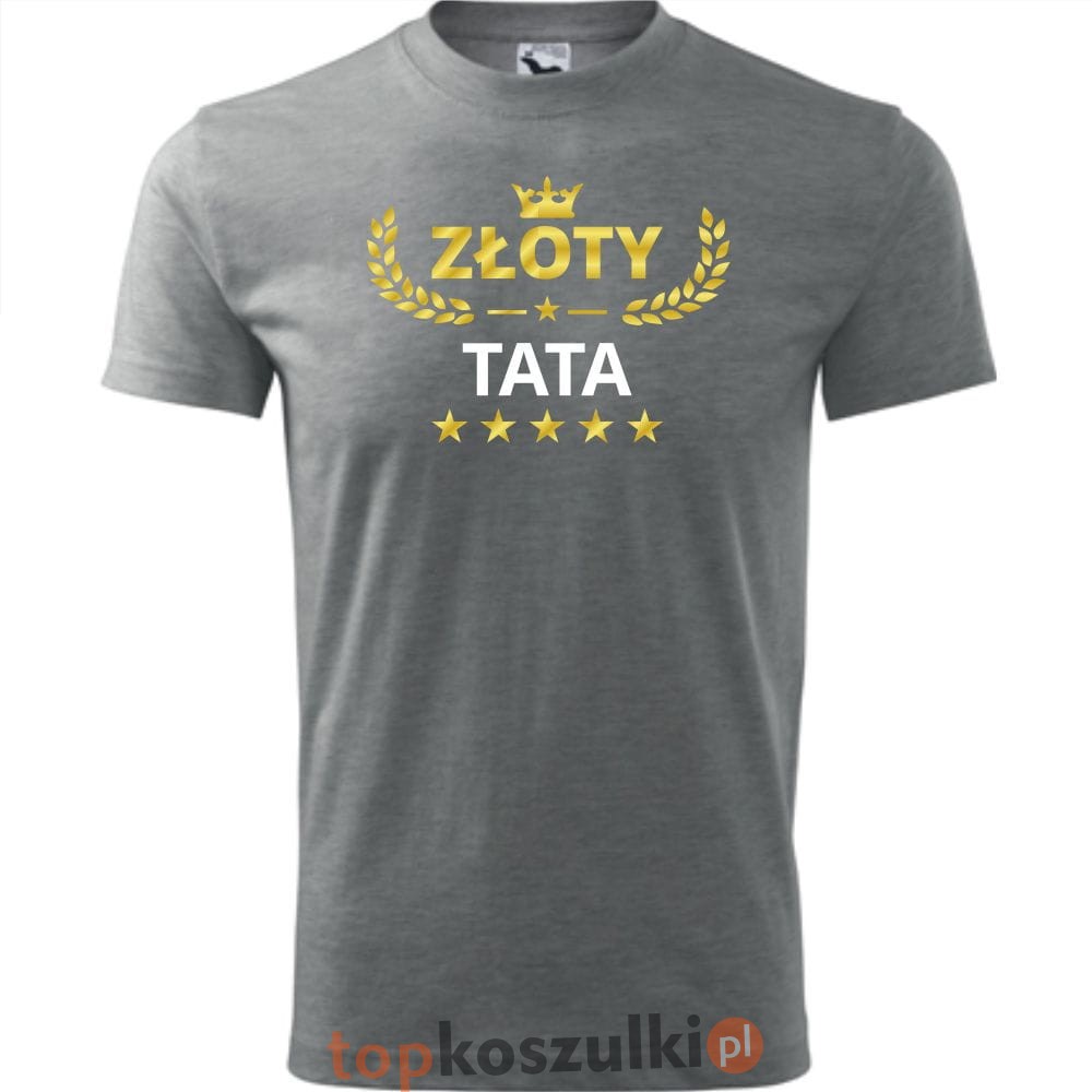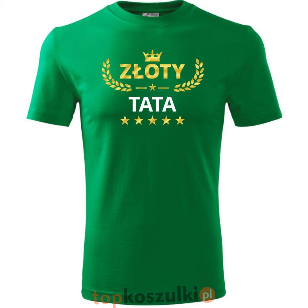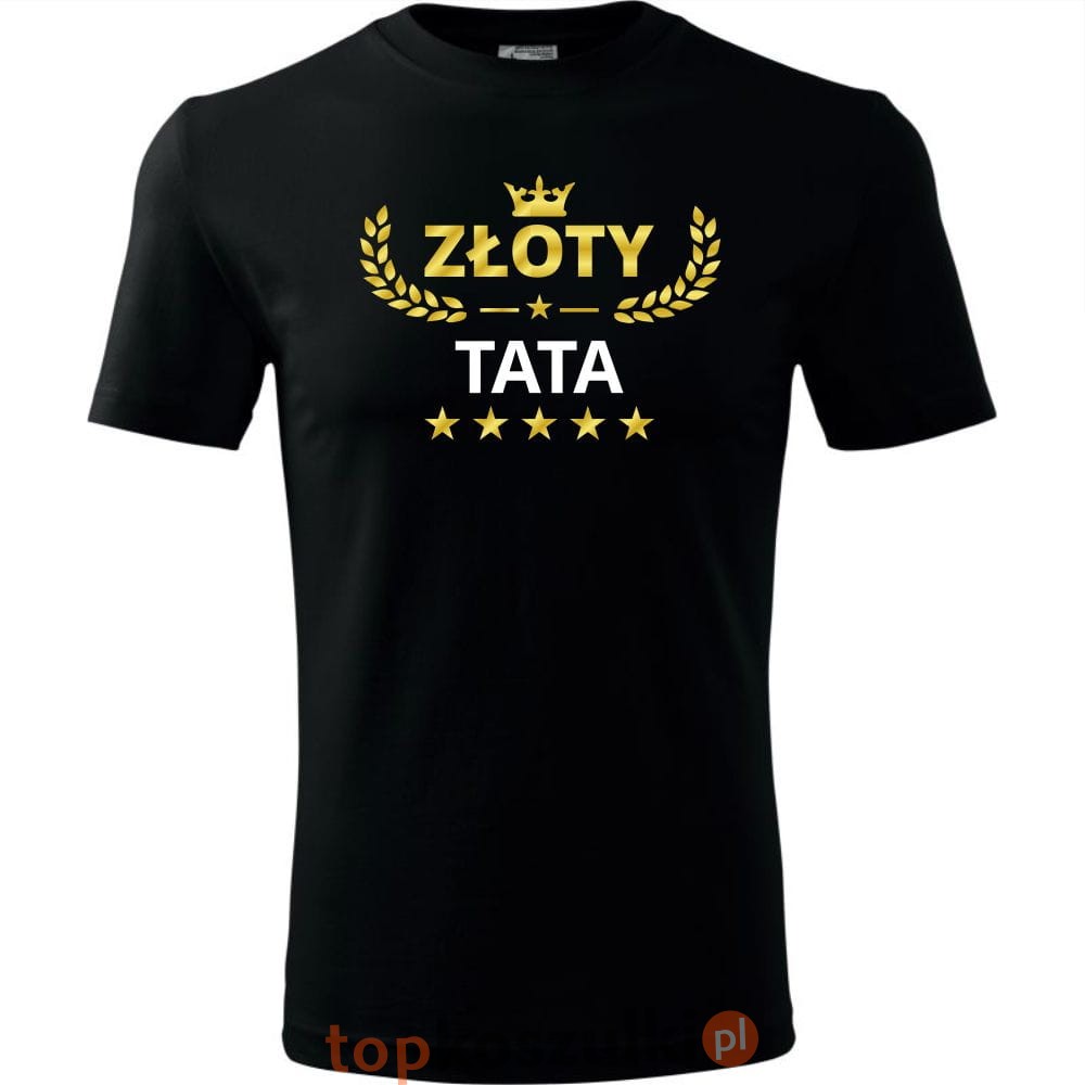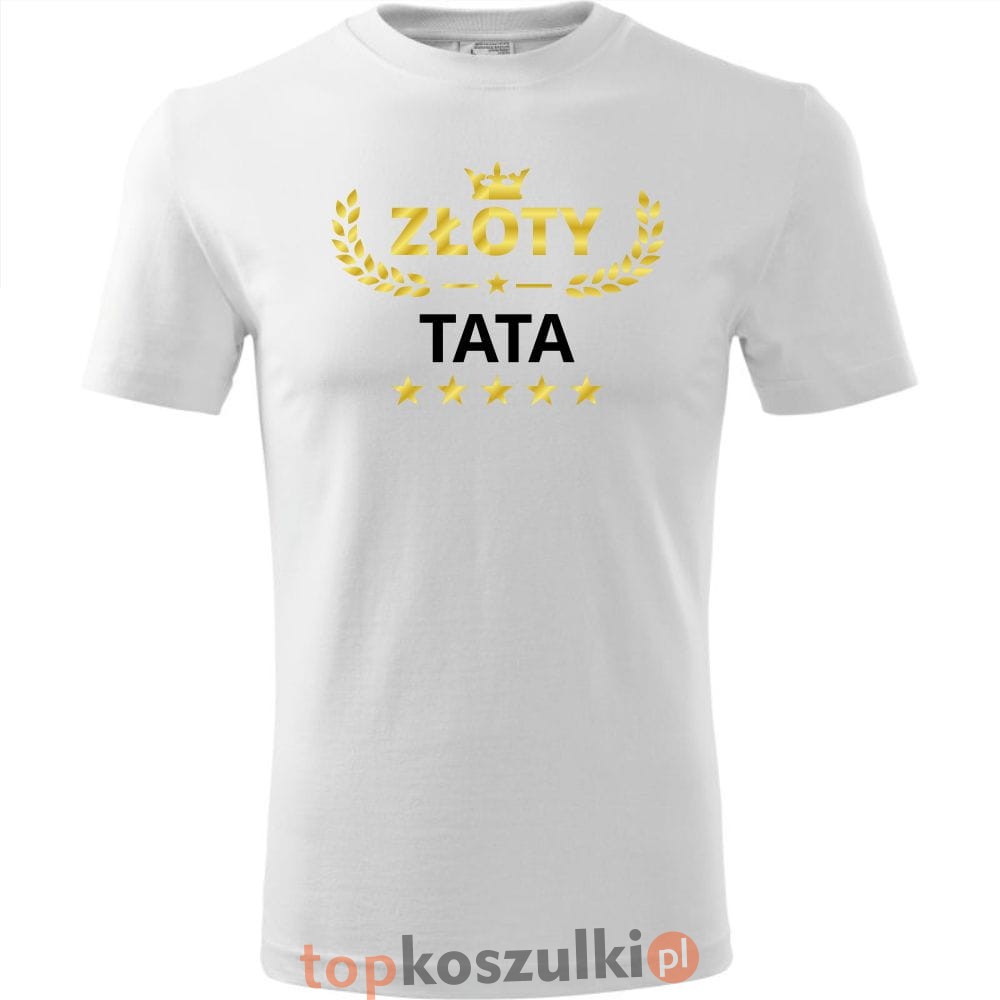 Nadruk na koszulce: Złota korona i wieniec laurowy oraz napis "ZŁOTY TATA" i pięć gwiazdek.