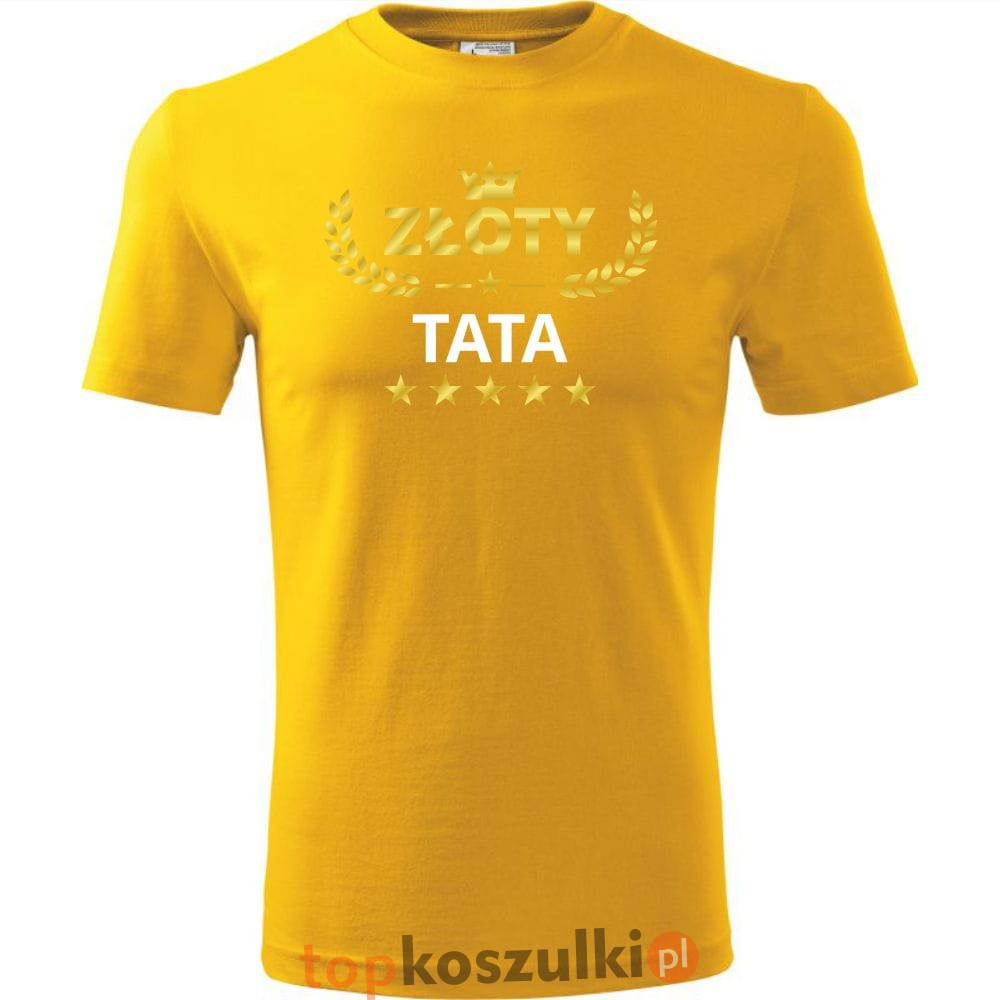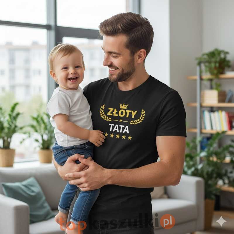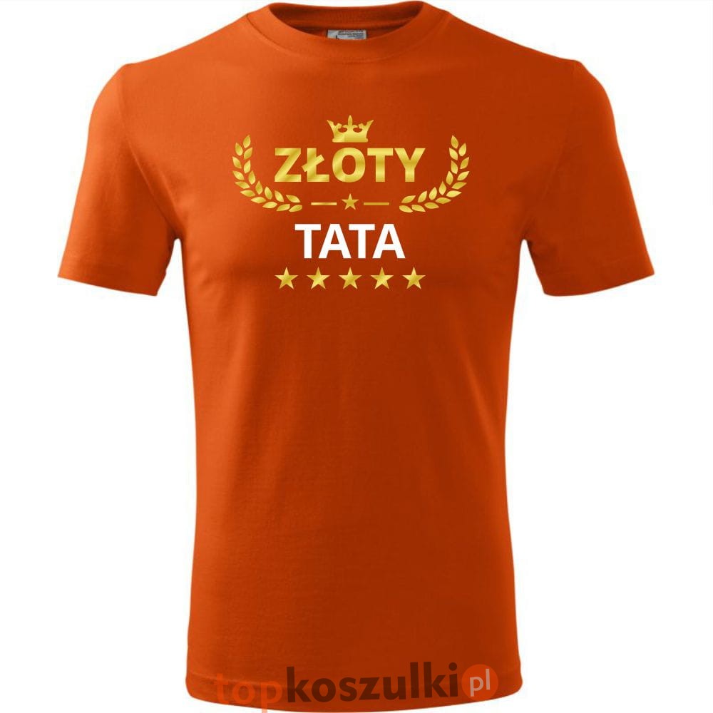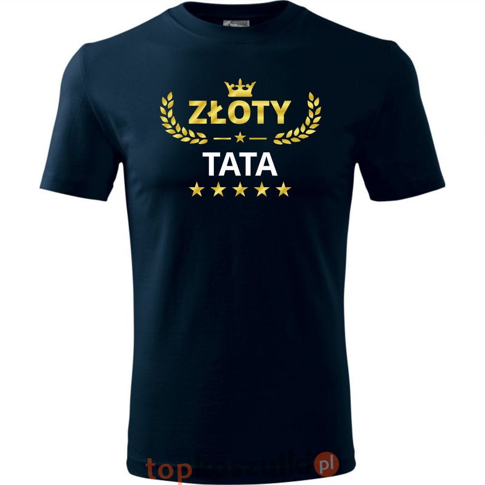 Nadruk na koszulce: Złota korona i wieniec laurowy oraz napis "ZŁOTY TATA" i pięć gwiazdek.