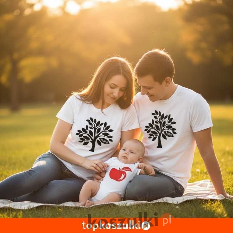 Oto, co zyskujesz: Wybierając nasz zestaw, otrzymujesz nie tylko wysokiej jakości odzież, ale przede wszystkim symbol Waszej jedności. Koszulki i body wykonane są z miękkiej, oddychającej bawełny (marka Malfini), która zapewnia komfort noszenia przez cały dzień – zarówno dla rodziców, jak i dla najmłodszych. Trwały nadruk w postaci pięknego drzewa (dla Mamy i Taty) symbolizuje korzenie i siłę Waszej rodziny. Body dla dziecka z motywem jabłka i spersonalizowanym imieniem (jak Tomek na przykładzie) to urocze nawiązanie do owocu Waszej miłości.