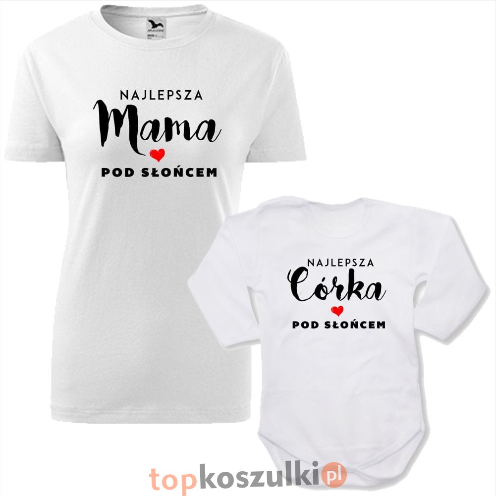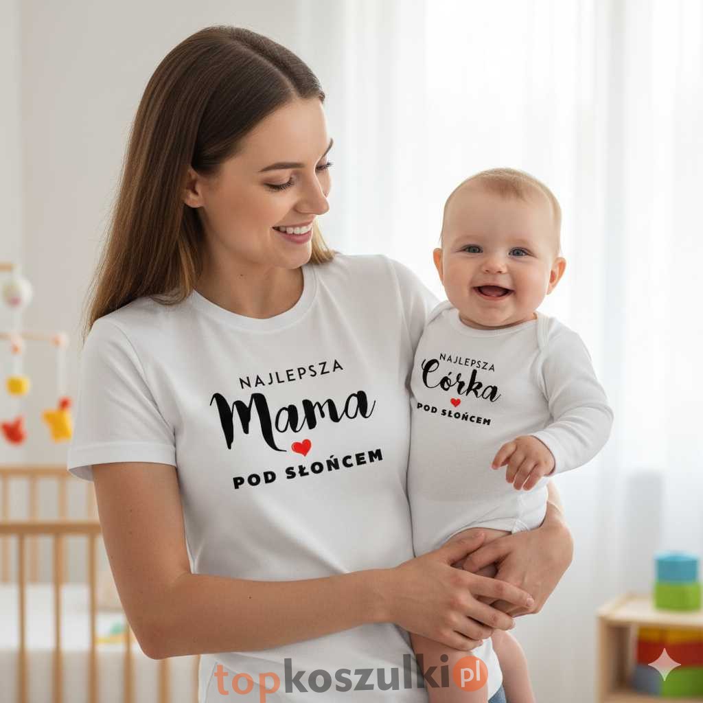Wyraźcie swoją niezwykłą więź z tym uroczym i pełnym miłości zestawem dla Mamy i Córki! Ten dwuczęściowy komplet składa się z białej koszulki damskiej z napisem "NAJLEPSZA Mama POD SŁOŃCEM" oraz białego body niemowlęcego (lub koszulki dziecięcej) z napisem "NAJLEPSZA Córka POD SŁOŃCEM", oba ozdobione słodkim, czerwonym serduszkiem. To idealny sposób, aby podkreślić Waszą wyjątkową relację i pokazać światu, jak wiele dla siebie znaczycie. Doskonały pomysł na prezent na Dzień Matki, baby shower, urodziny, święta, czy po prostu, aby sprawić radość.