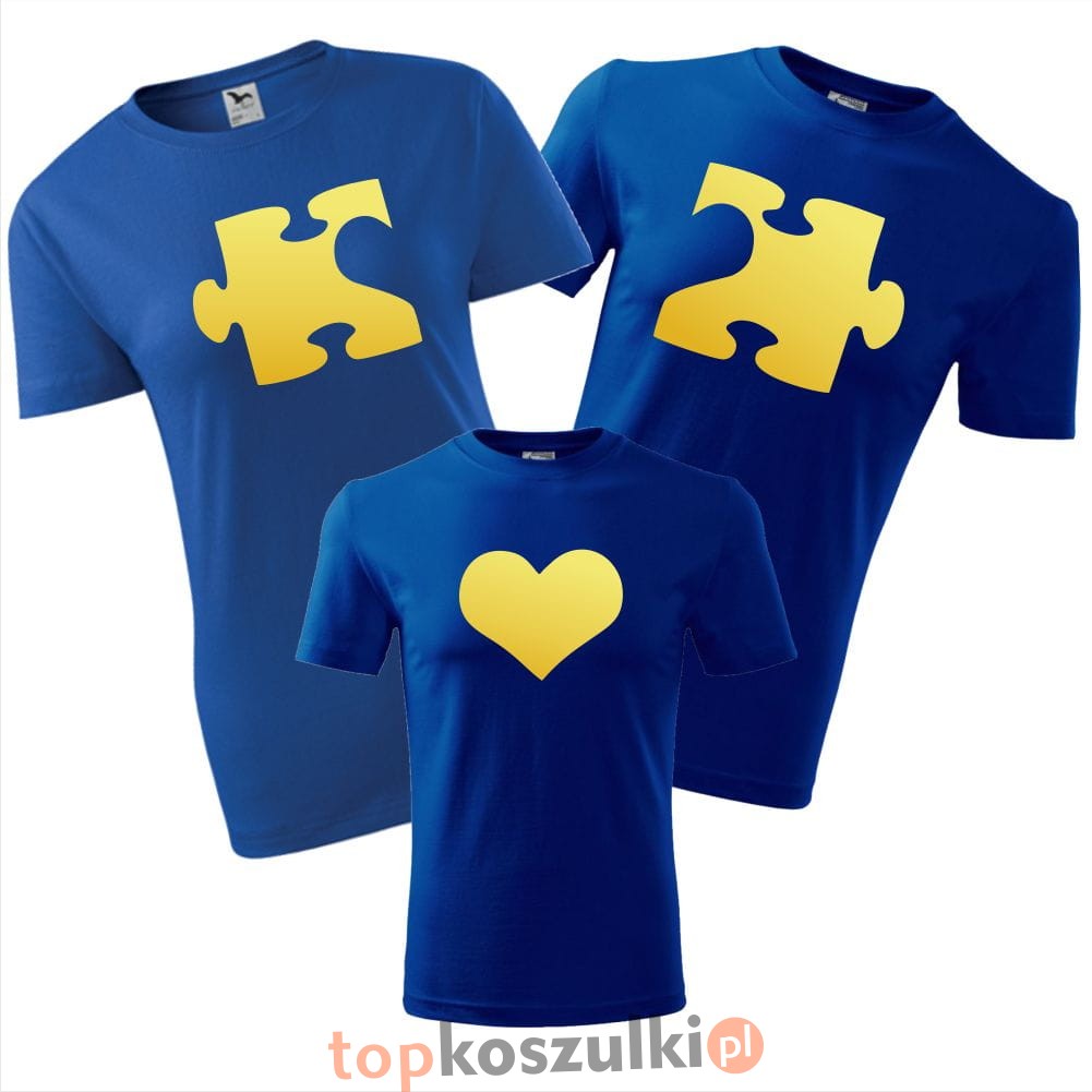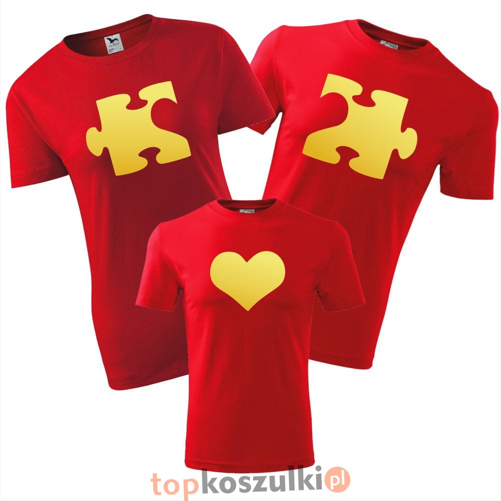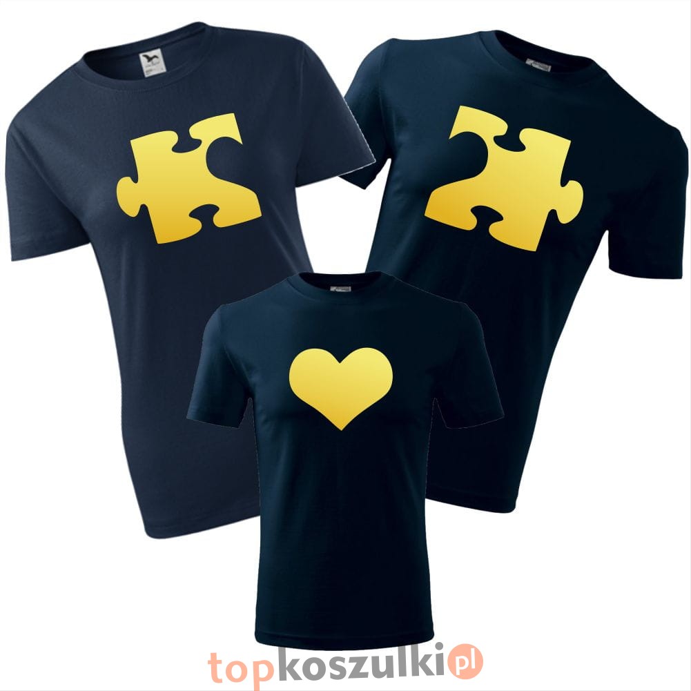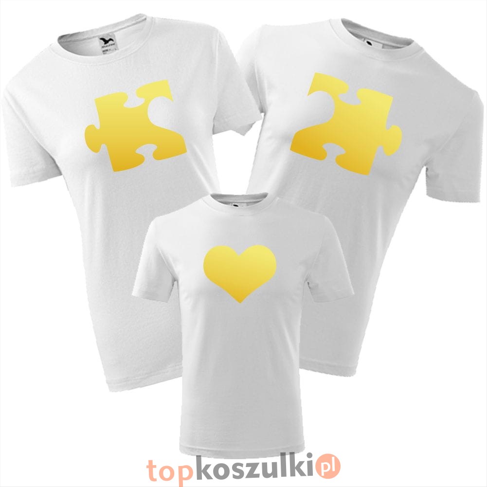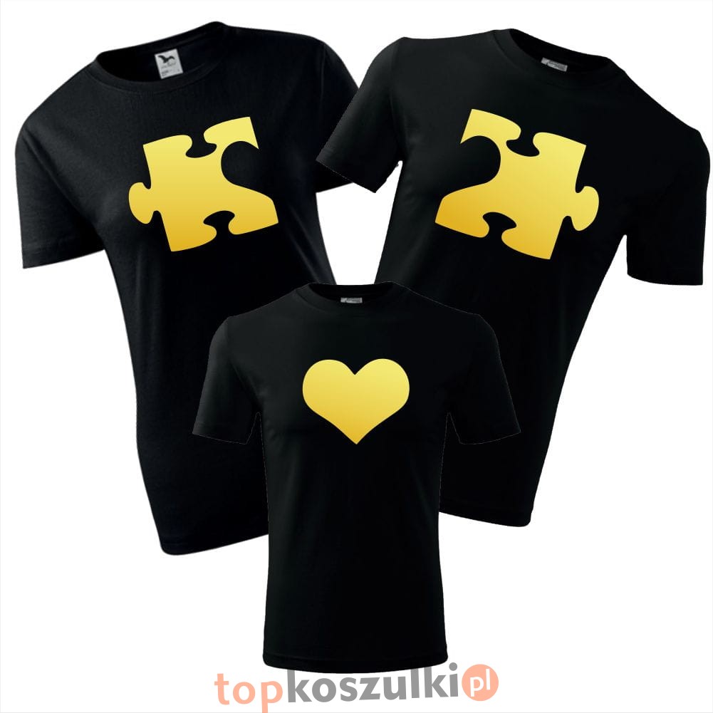 zestaw koszulek dziecięca, damska i męska - złote puzzle + serce