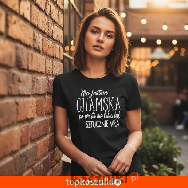 Wyróżnij się z tłumu i wyraź swoją autentyczność z naszą czarną koszulką damską z wyjątkowym nadrukiem: "Nie jestem CHAMSKA, po prostu nie lubię być SZTUCZNIE MIŁA". Ta koszulka to idealny wybór dla kobiet, które cenią sobie szczerość, dystans i poczucie humoru.