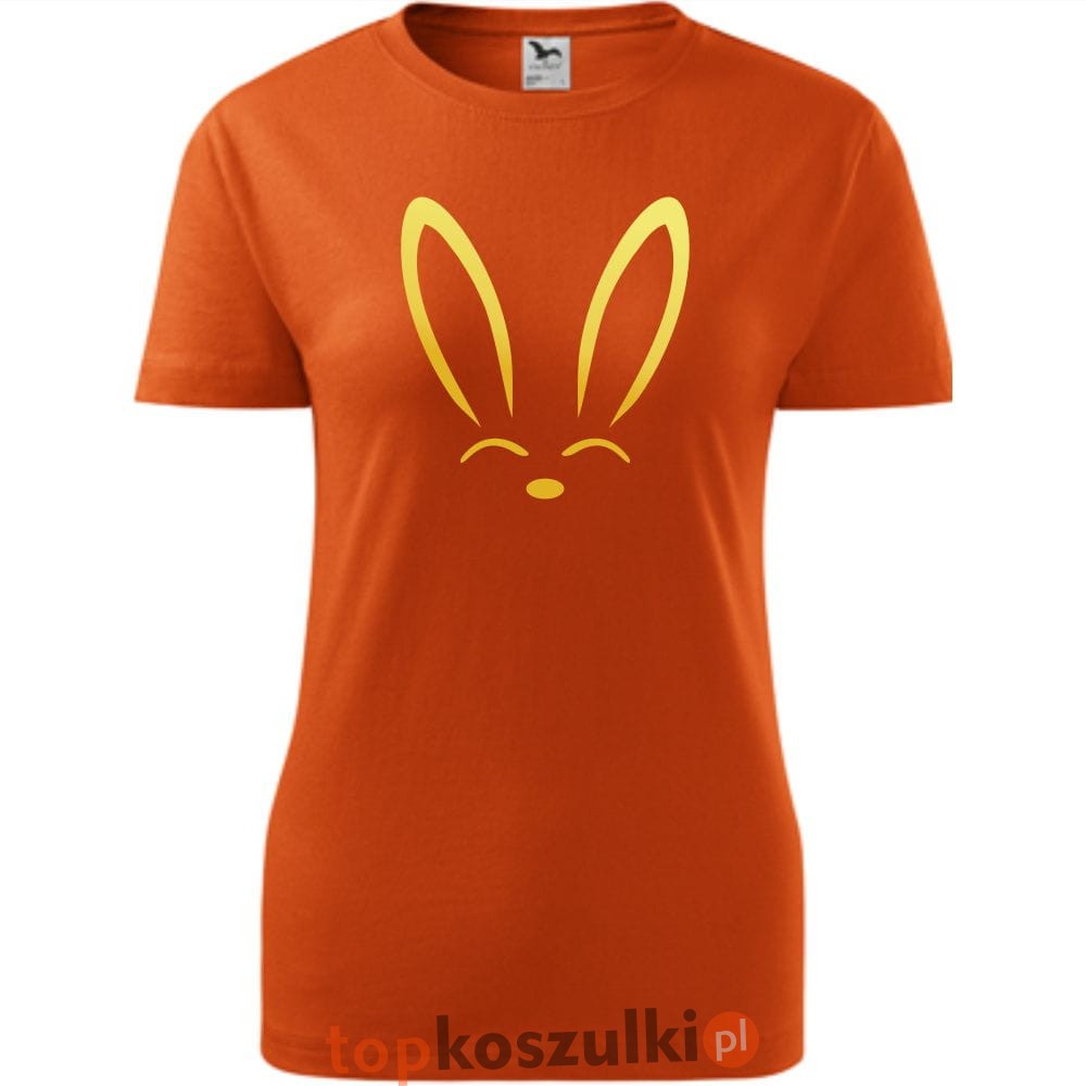 Koszulka damska „Złoty zając” dostępna jest w naszym sklepie w wielu kolorach i rozmiarach. Na pewno każda kobieta znajdzie coś dla siebie. Oprócz zabawnego nadruku w postaci złotych uszu i nosa zajączka z przodu koszulki, masz możliwość personalizowania nadruku z tyłu – napis może zawierać imię osoby, dla której przeznaczony będzie prezent.