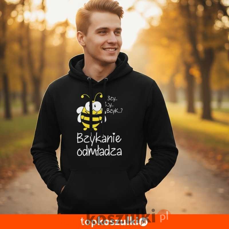 Szukasz niebanalnego i zabawnego elementu garderoby, który rozbawi Ciebie i Twoje otoczenie? Ta czarna bluza męska z kapturem to strzał w dziesiątkę! Unikalny nadruk przedstawiający wesołą pszczołę i hasło "Bzykanie odmładza" w połączeniu z onomatopeicznym dymkiem "Bzy... Bzy... Bzyk...?" gwarantuje uśmiech na twarzy. To idealny wybór dla osób z poczuciem humoru, miłośników pszczół, pszczelarzy lub po prostu tych, którzy cenią sobie wygodny i oryginalny styl.
